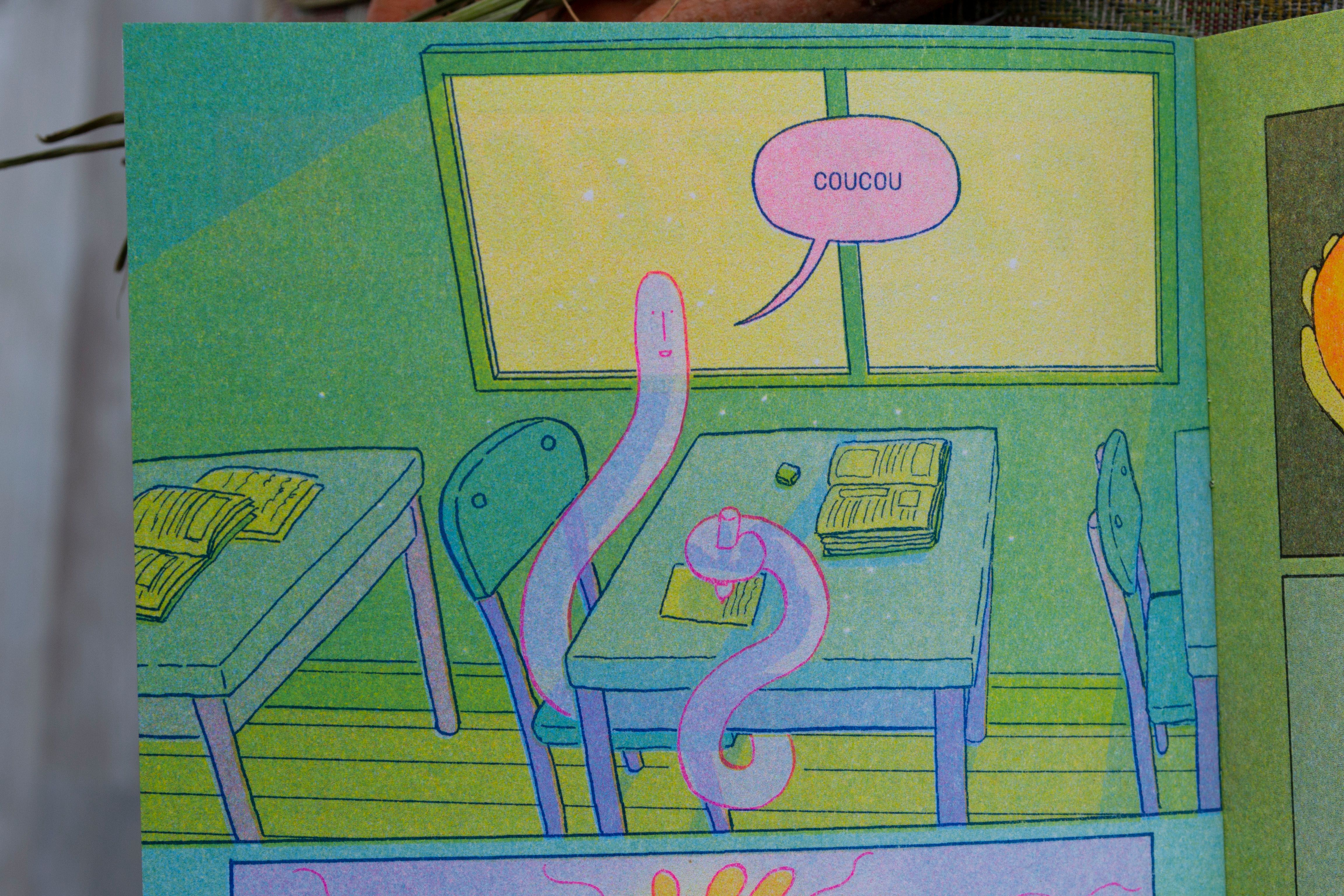 This is a 16 page fanzine printed at @hibouprintclub by @lazer.cao in risographie, 5 coulors. It's in french with a translation in spanish